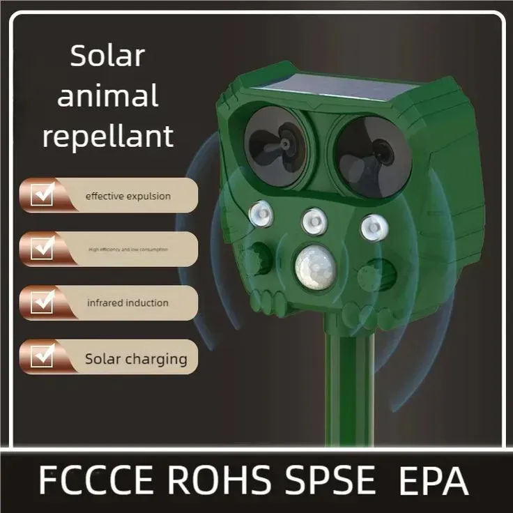 جهاز طرد الحيوانات الذكي يعمل بالموجات فوق الصوتية والطاقة الشمسية لطرد القطط، الكلاب والطيور من الحديقة أو السطح بطريقة آمنة وفعّالة دون إيذائها.